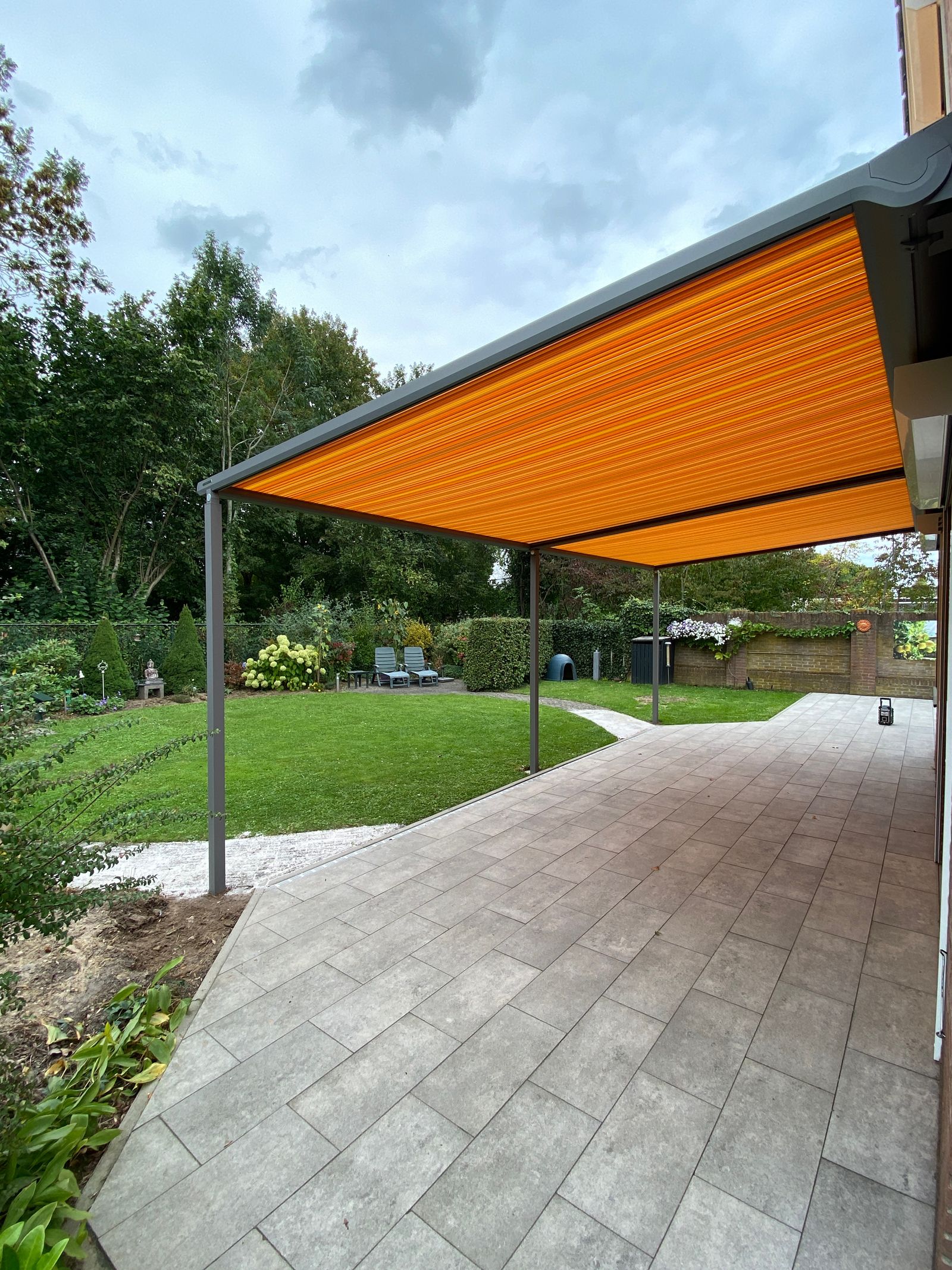De Plaza Viva van Weinor is één van de meest veelzijdige terrasoverkappingen op de markt. Door te kiezen voor een gekoppelde uitvoering kunnen meerdere delen naadloos aan elkaar verbonden worden, wat zorgt voor een extra groot, uniforme overkapping. Dankzij het robuuste design en het fraaie doek in warme oranje tinten, vormt deze constructie een echte meerwaarde voor elke tuin.