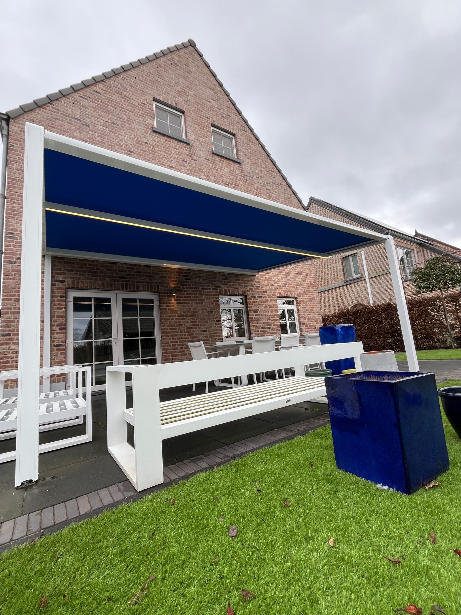 Bij Atrox houden we van projecten waar functionaliteit en uitstraling elkaar versterken. Voor deze realisatie in Dilsen koos de klant voor een TUMBA met een felblauw doek. Een gedurfde keuze, maar net daardoor klopt het plaatje: het blauw komt terug in diverse tuinelementen en geeft het terras een frisse, opvallende look.