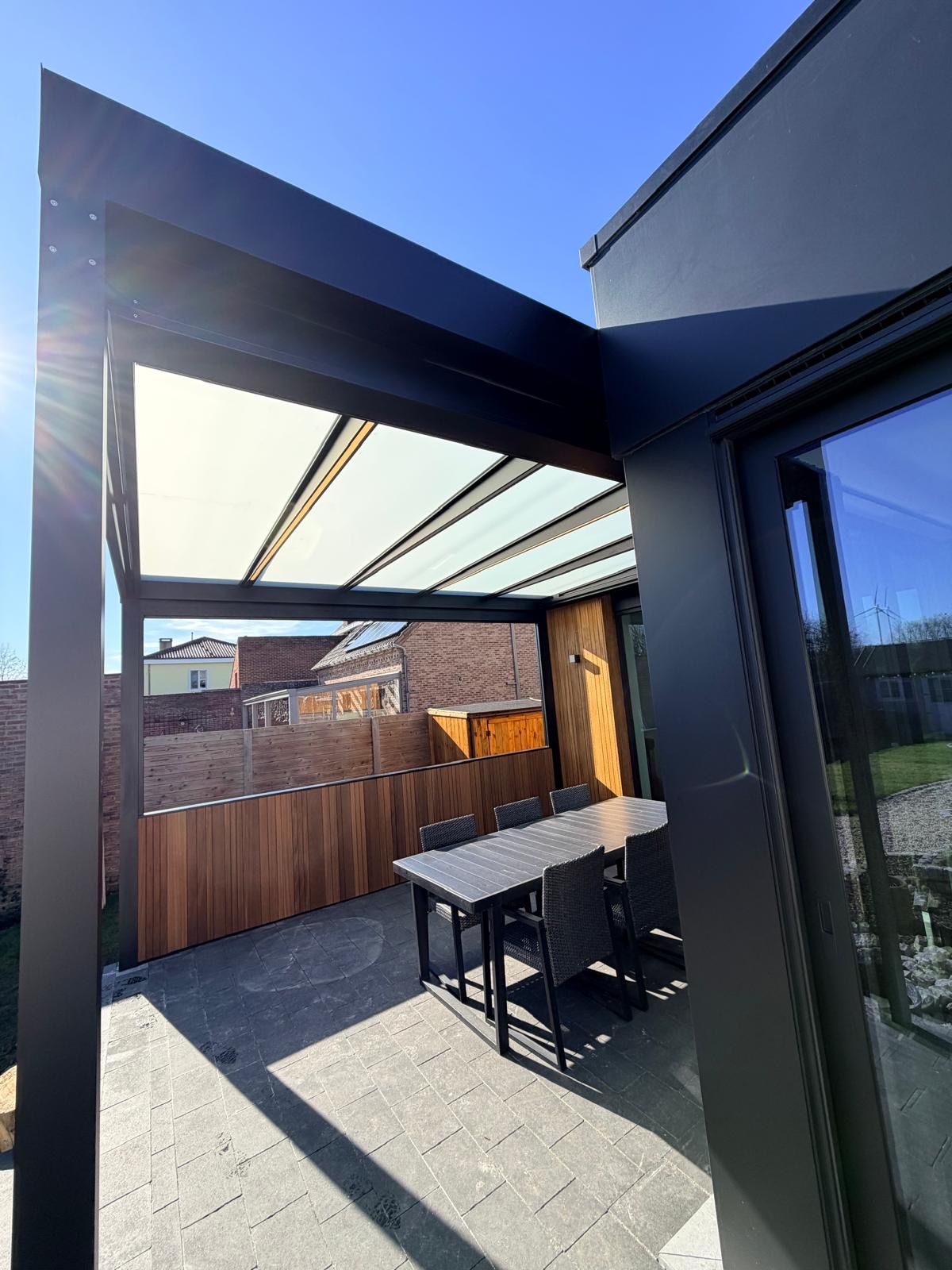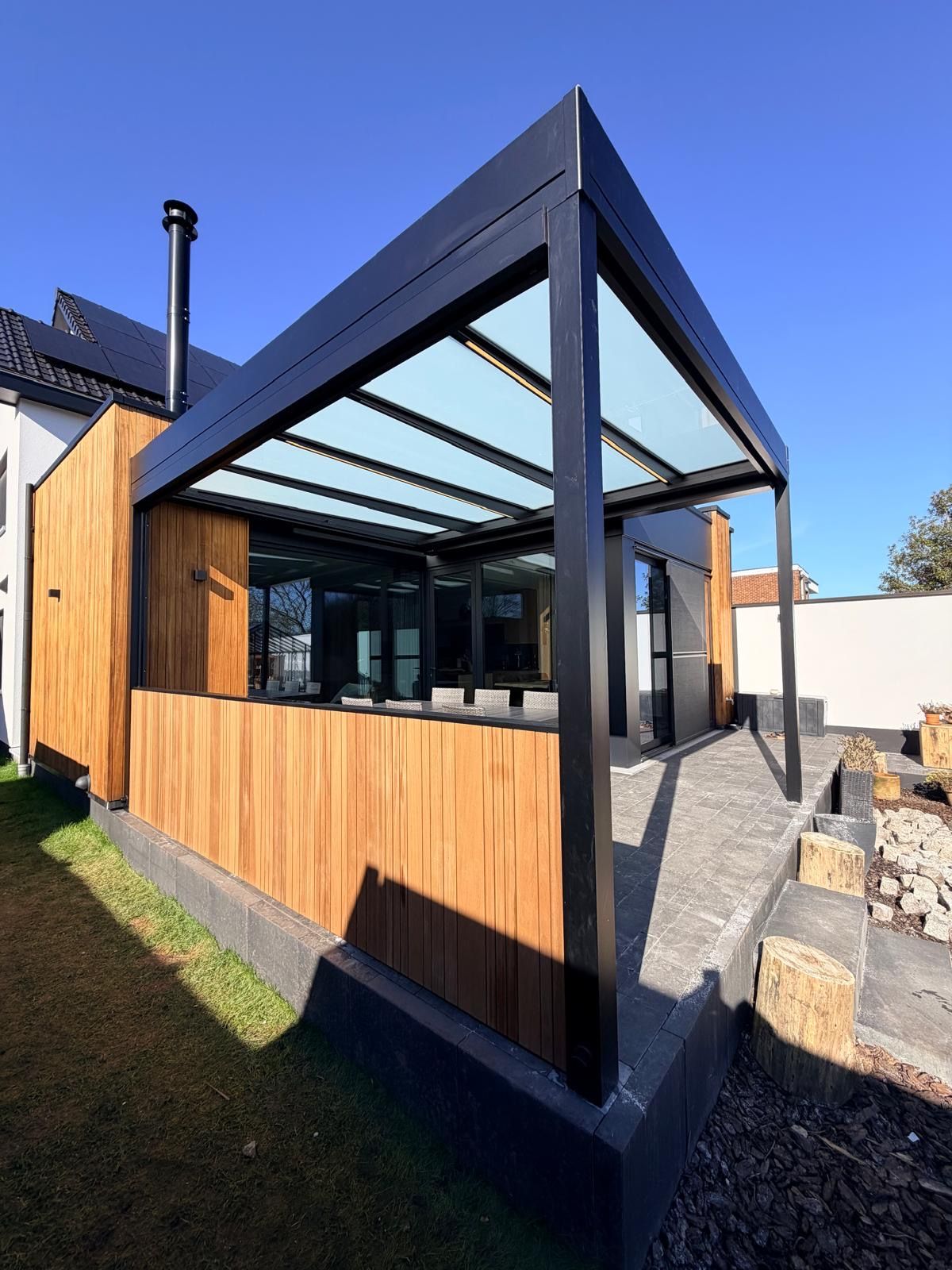 Een terrasoverkapping mag er niet alleen strak uitzien — ze moet vooral kloppen in functie van de woning, de tuin én de technische situatie. Voor deze realisatie kozen we voor onze Weinor Terrazza Pure Max: een kubistisch glazen terrasdak met een minimalistische look. Het project kreeg een extra uitdaging door een speciale montagesituatie: de overkapping staat deels vrijstaand, waardoor stabiliteit, verankering en afwatering tot in detail moesten worden uitgewerkt.
