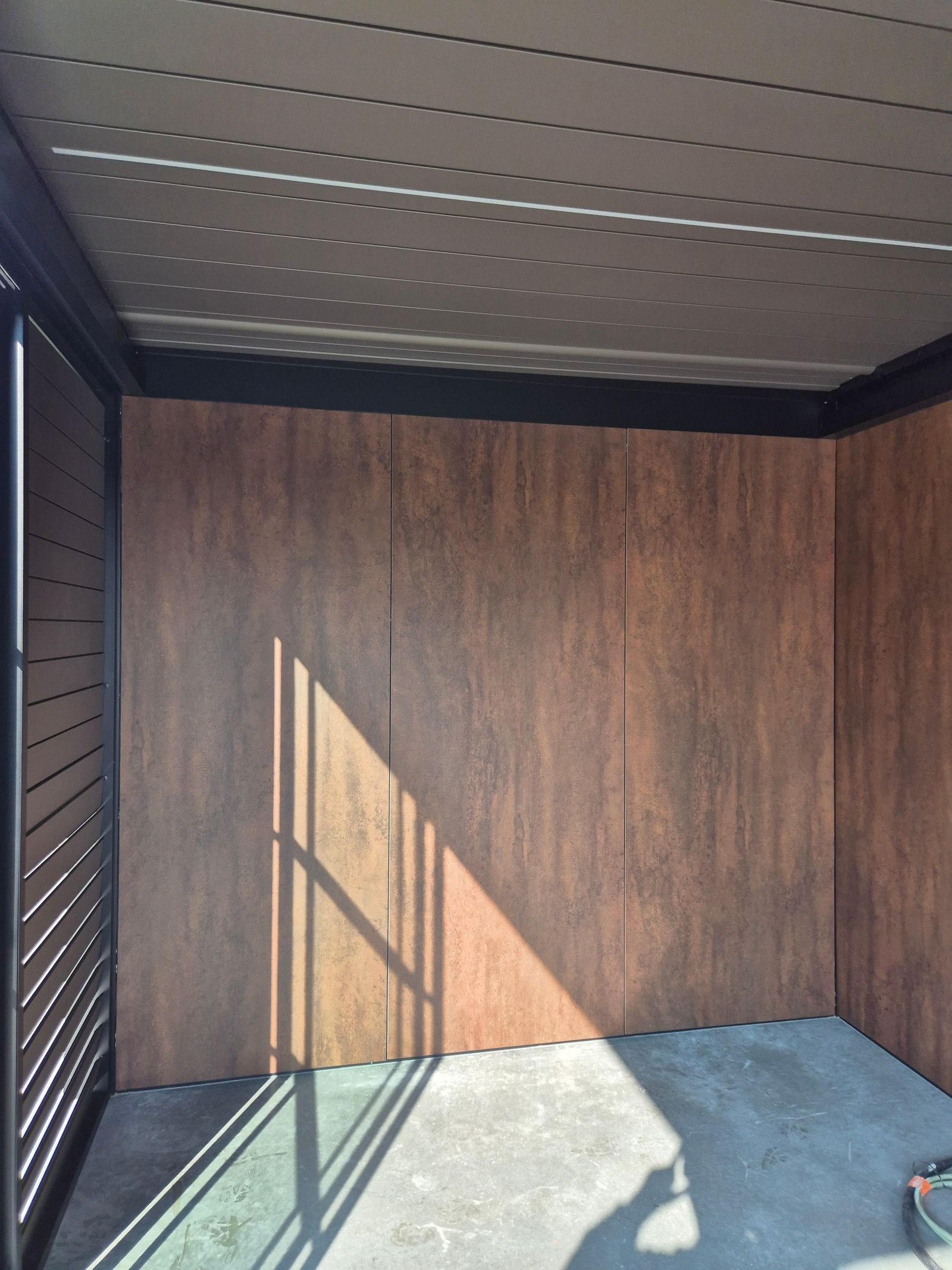 Een opvallend element in deze realisatie is de achterwand in Trespa met uitzicht van cortenstaal. Deze wand geeft de tuinkamer een warme, karaktervolle toets en vormt een mooi contrast met de andere materialen in het project.