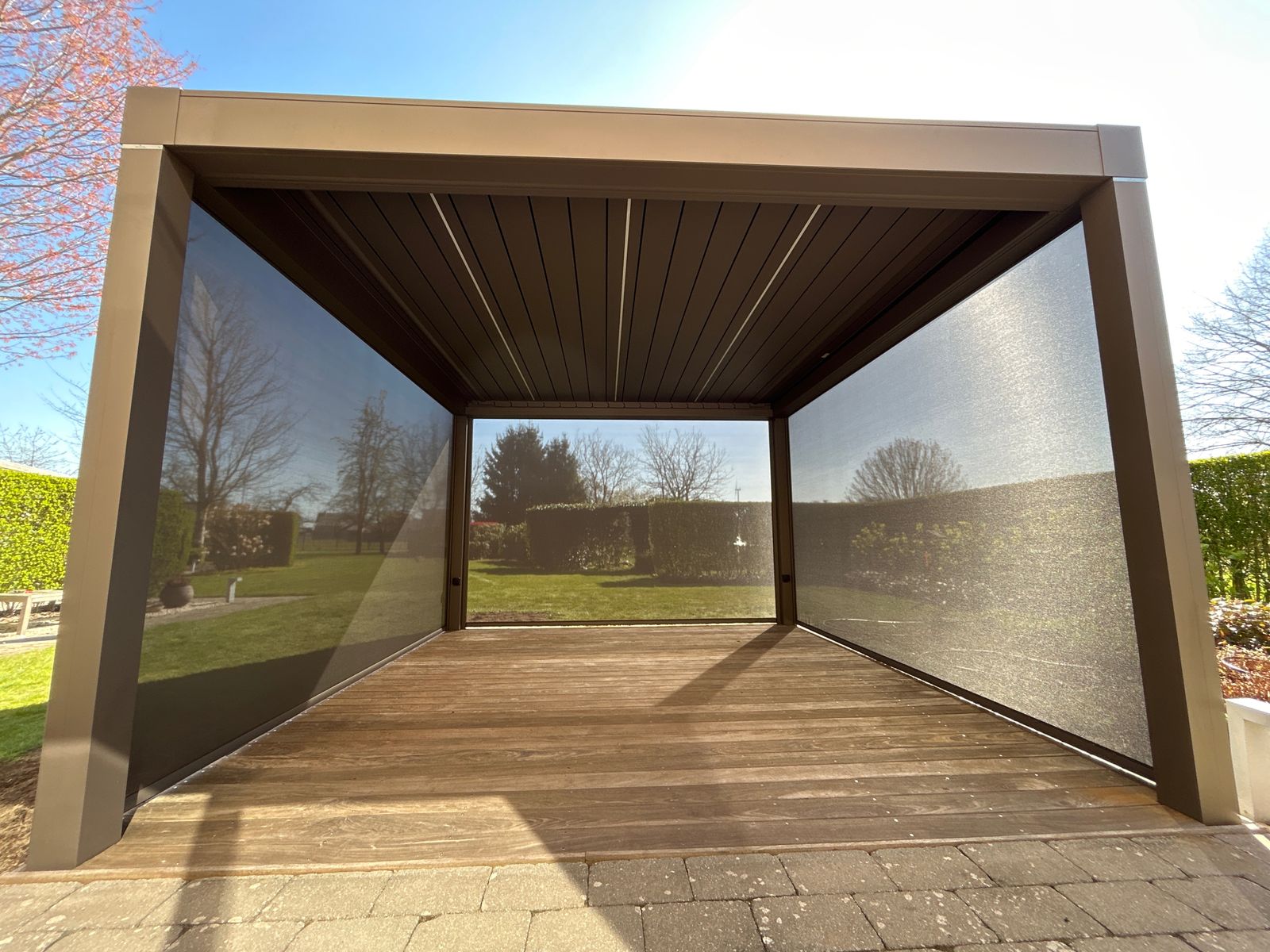 Wat deze realisatie extra bijzonder maakt, is de gekozen sepia/marrone kleur. Die warme tint sluit naadloos aan bij de houten vlonder en vormt tegelijk een mooi geheel met de gevel en de natuurlijke omgeving. Zo oogt de overkapping niet alleen elegant en tijdloos, maar ook alsof ze er altijd al heeft gestaan.