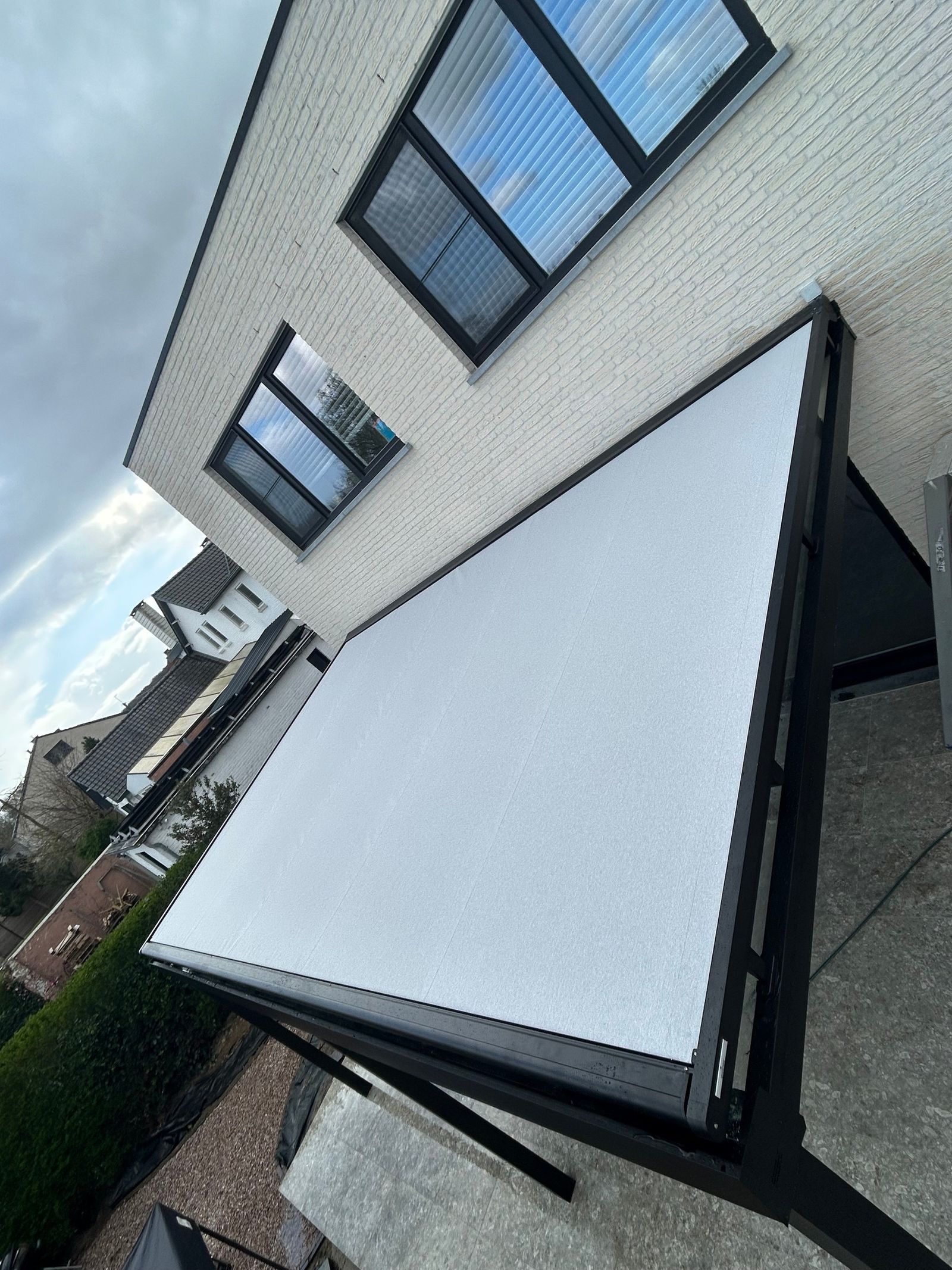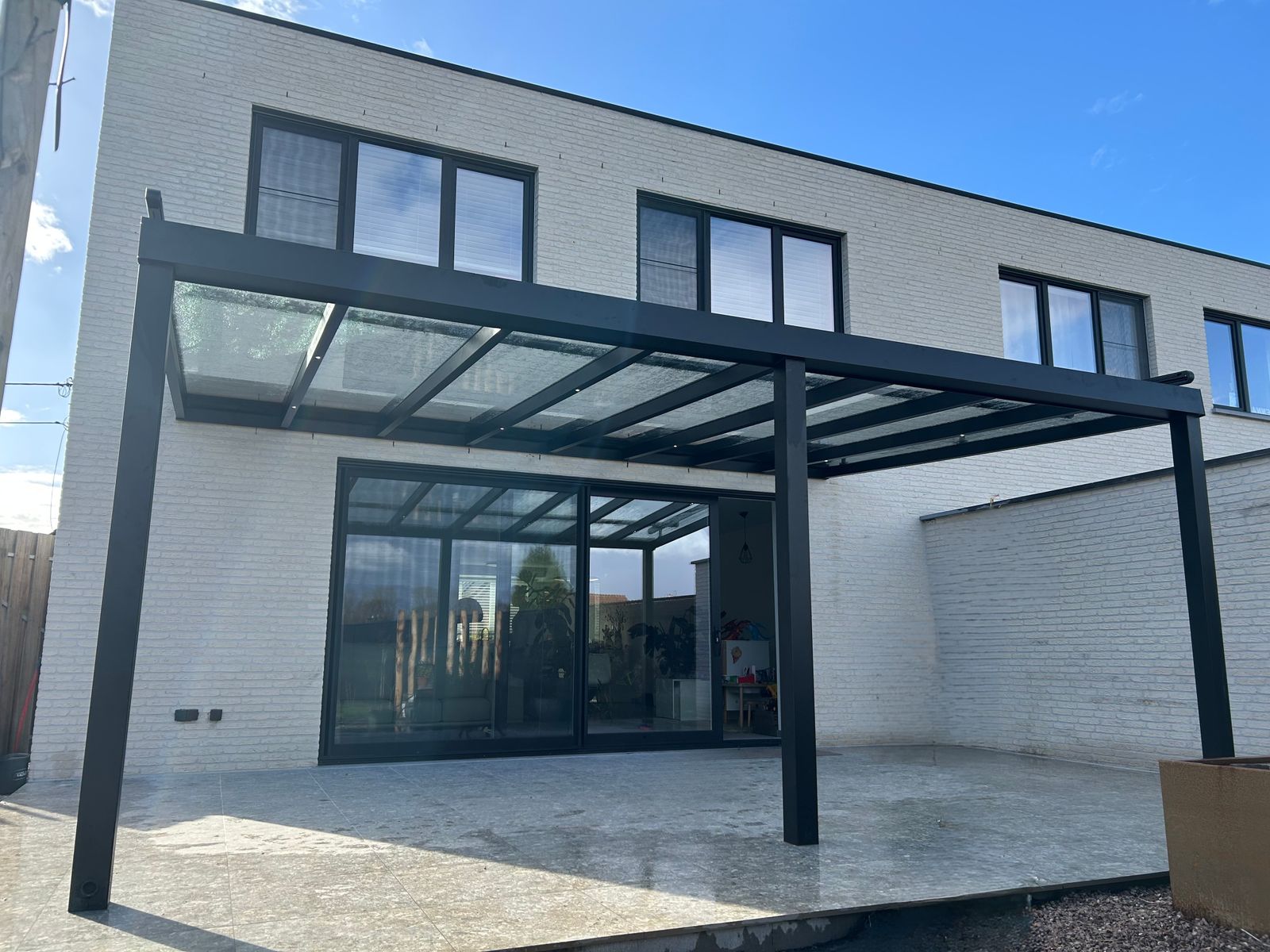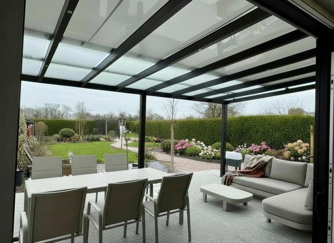 De constructie sluit mooi aan bij de woning en biedt beschutting zonder het zicht op de tuin te verliezen. Overdag genieten de bewoners van natuurlijk licht, en wanneer de zon stevig doorkomt zorgt de zonwering voor aangename schaduw — ideaal om te tafelen, te ontspannen of gewoon langer buiten te leven.